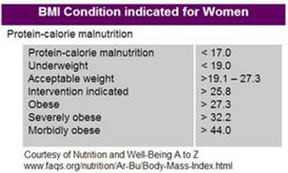 A healthy woman's Body Mass Index (BMI) is between 18.5 - 25